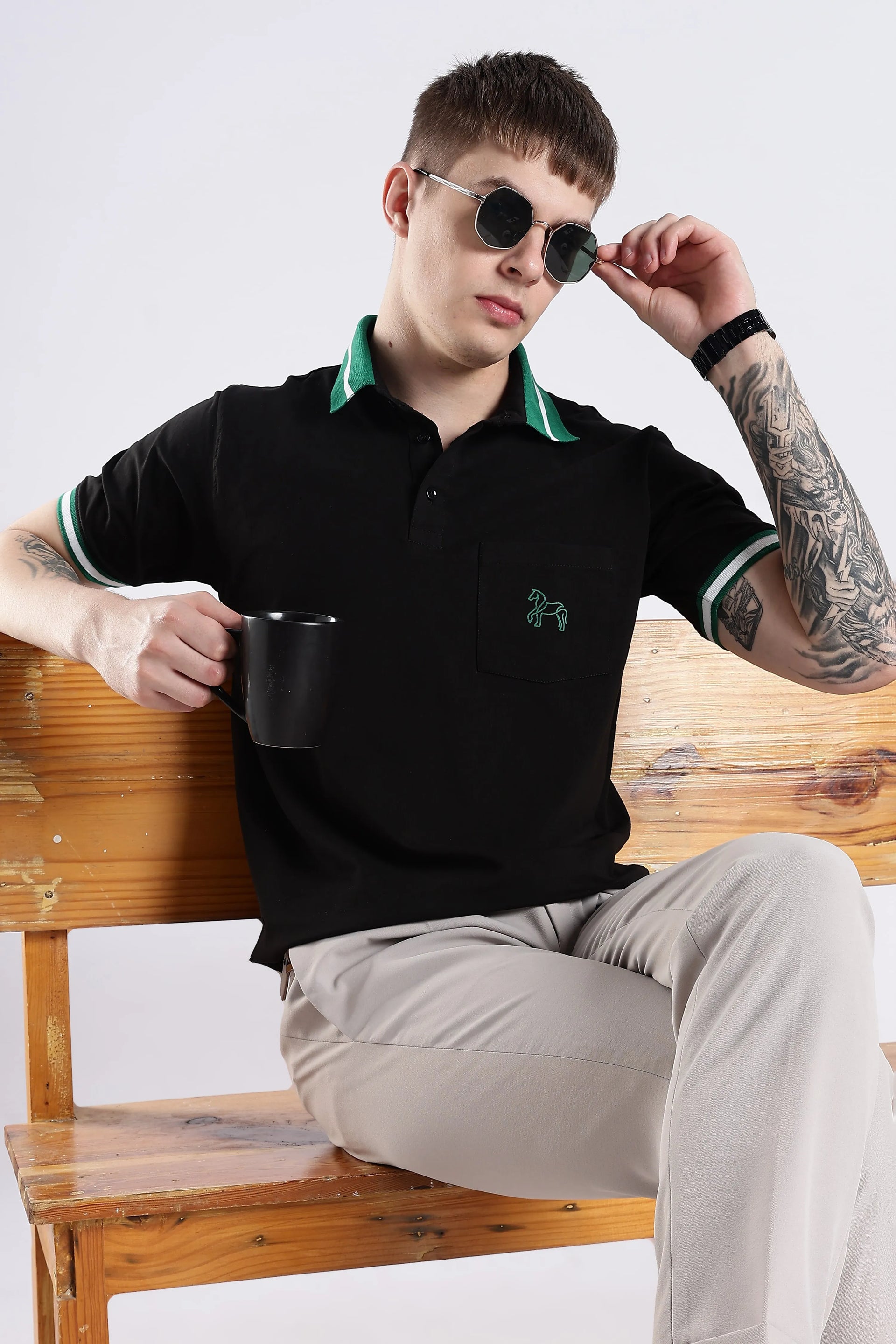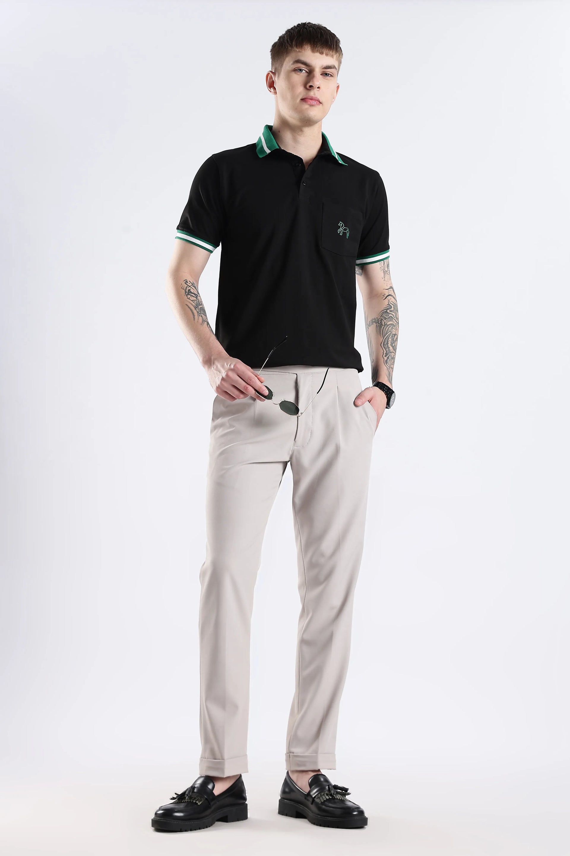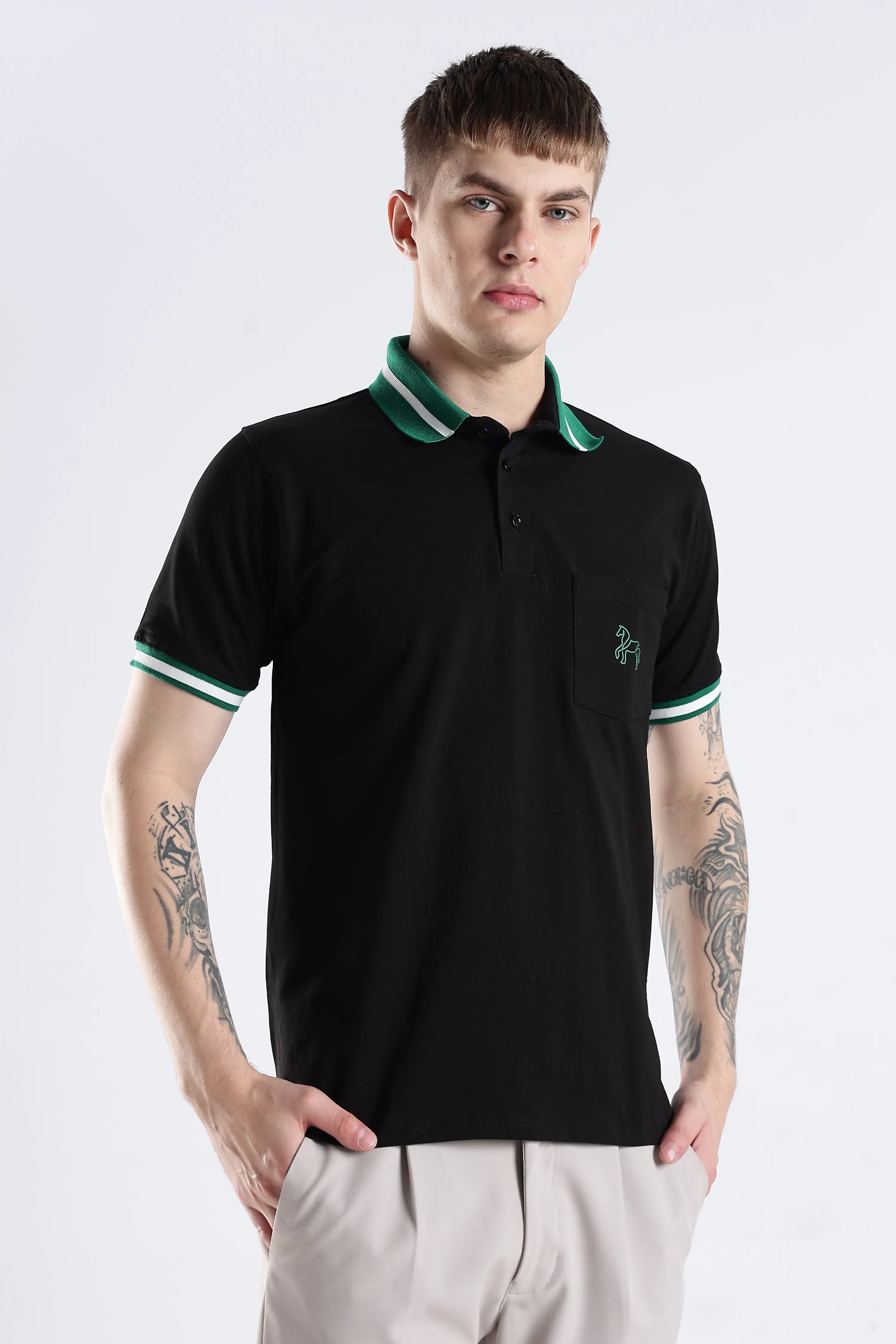 The Emerald Stallion Black Polo blends 96.5% cotton with 3.5% spandex, offering a refined balance of softness and flexibility. Its textured collar and sleeve details add subtle sophistication, while the addition of a practical chest pocket enhances both style and functionality. Designed for breathability and lasting wear, this polo delivers an expert-level finish suited for versatile everyday style.