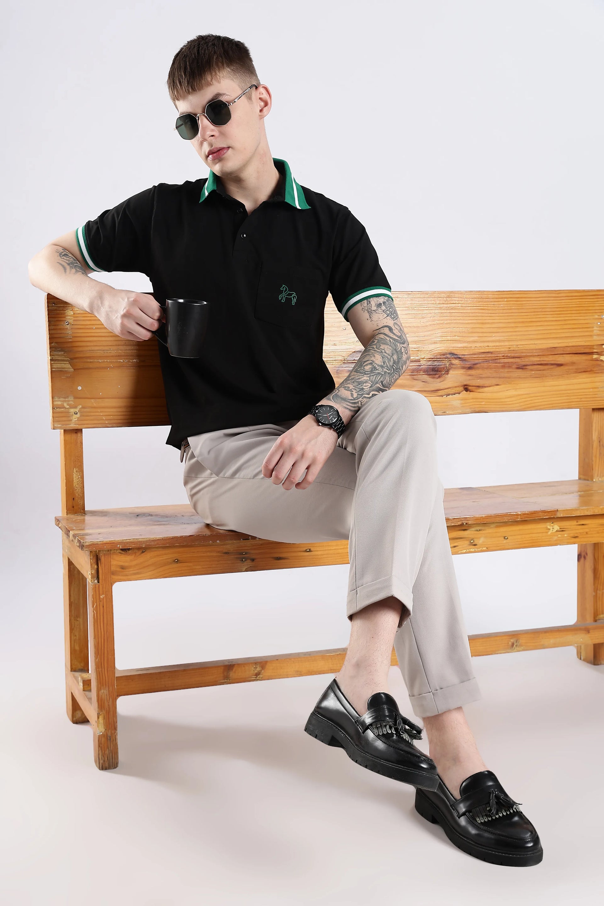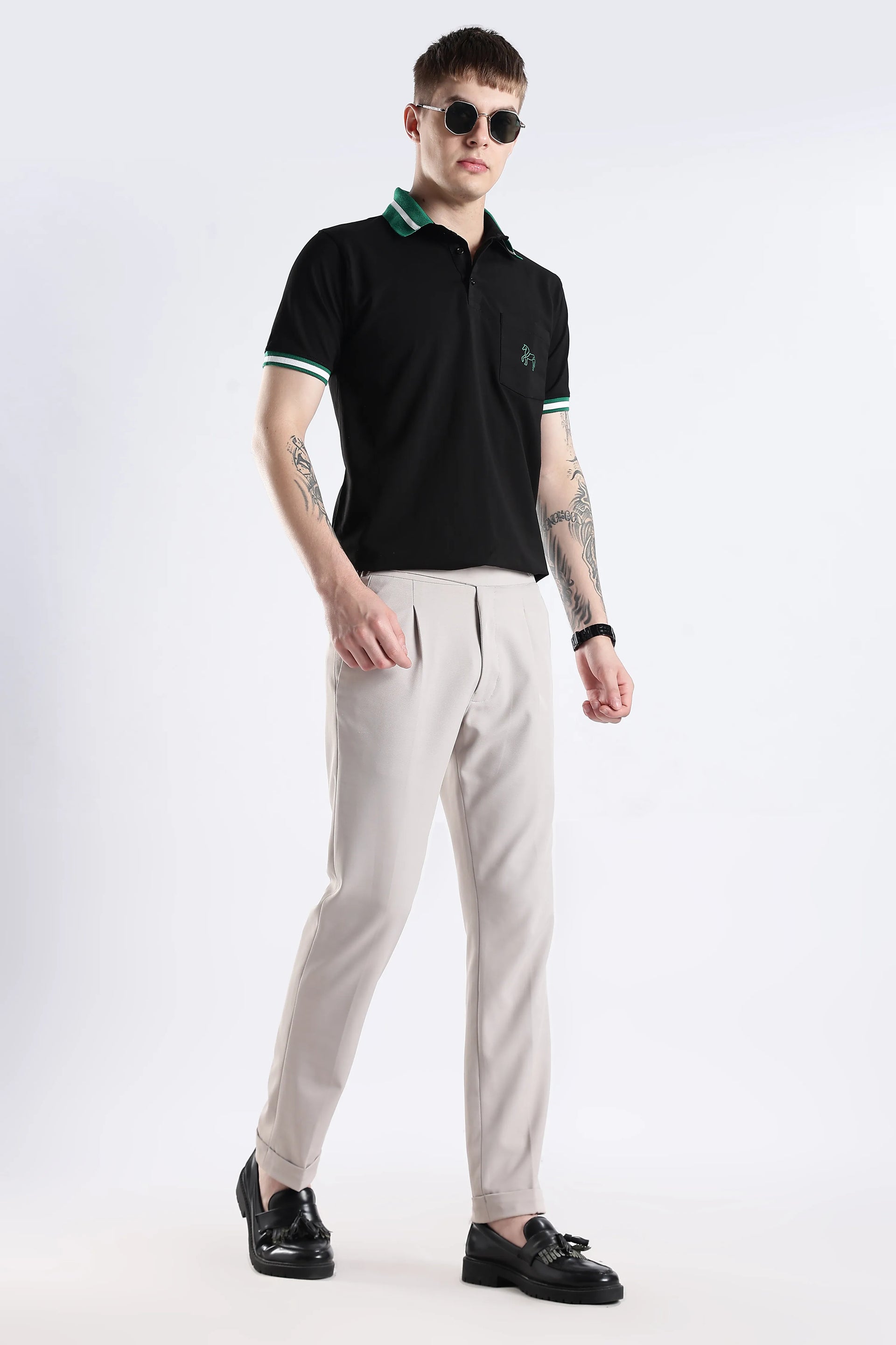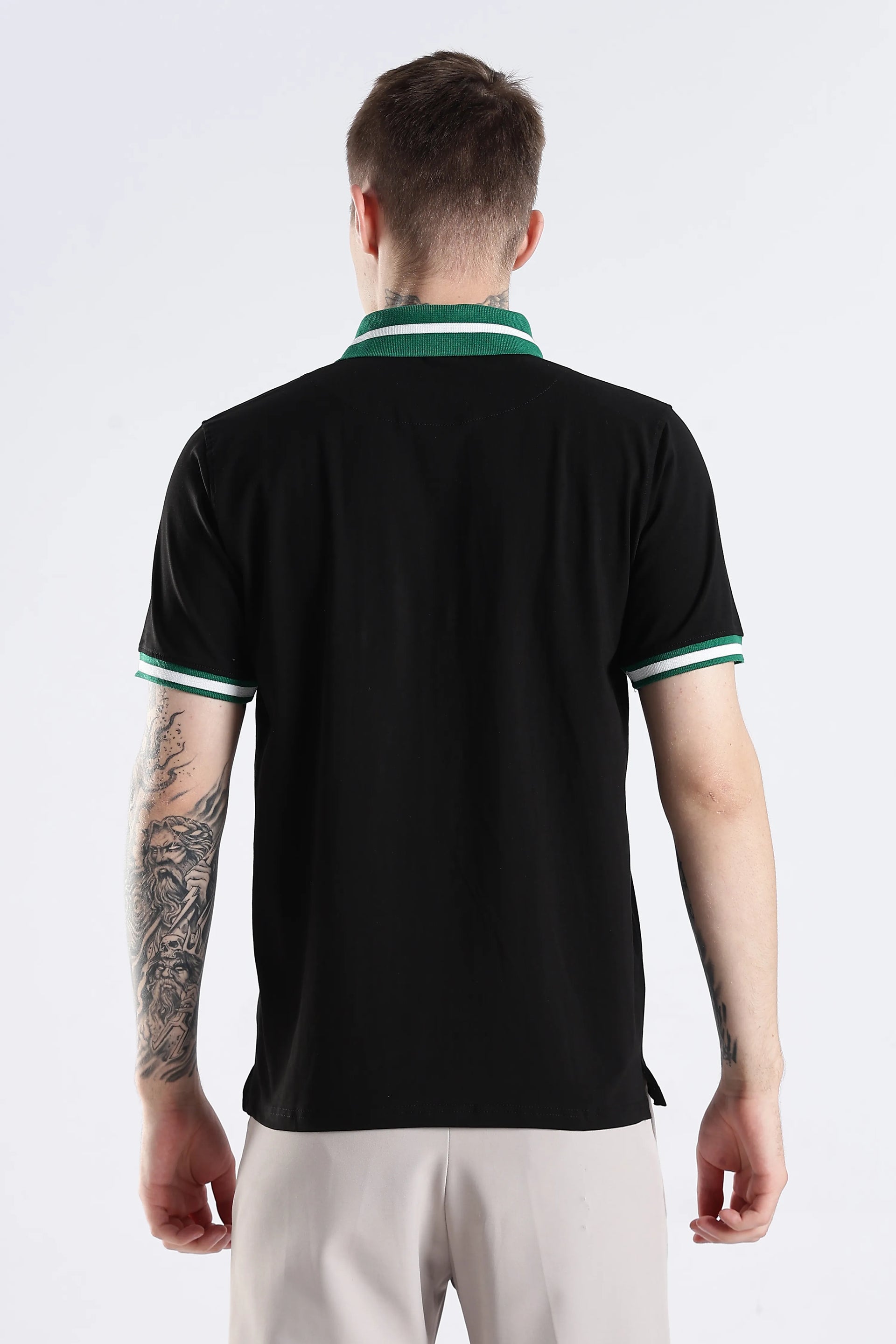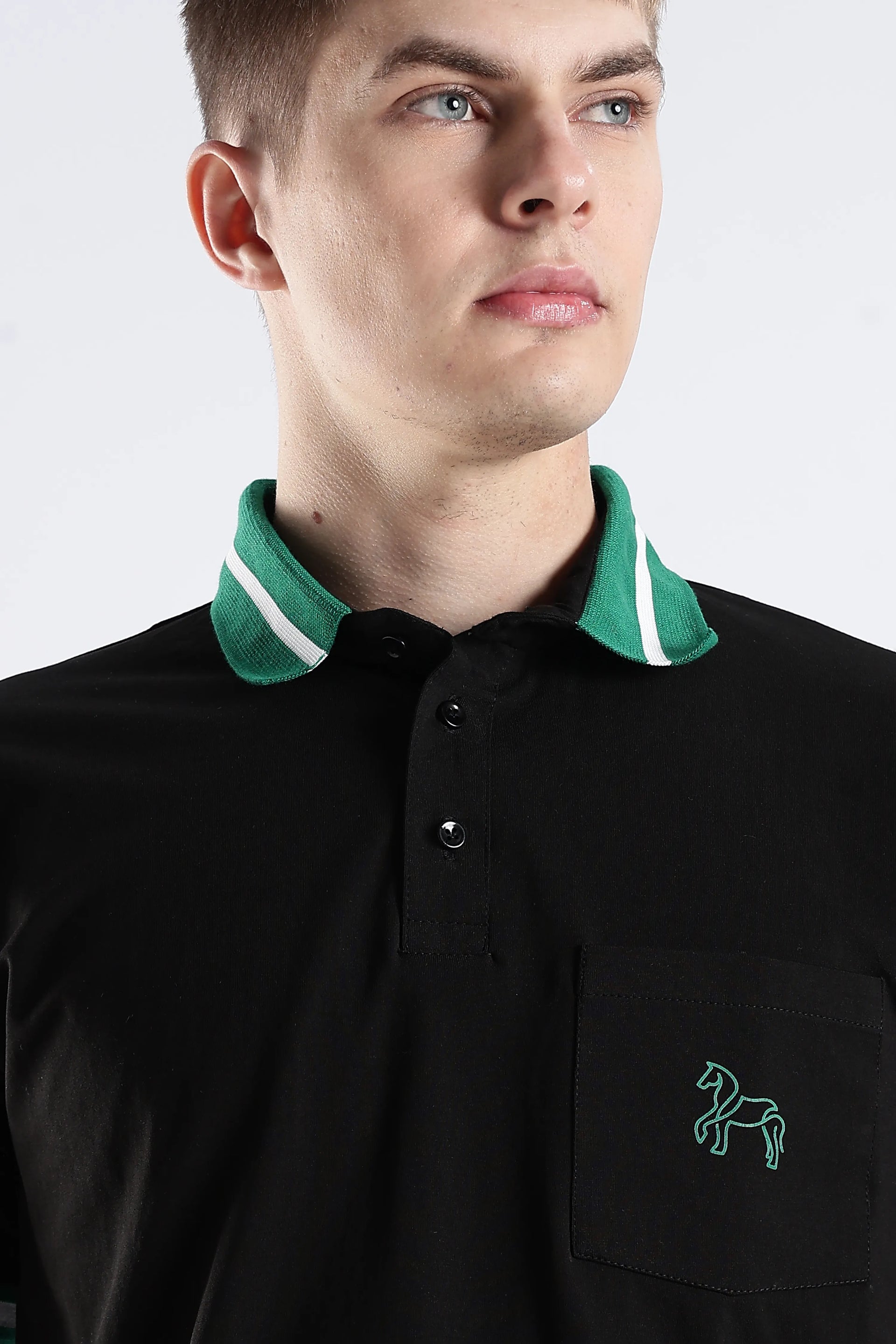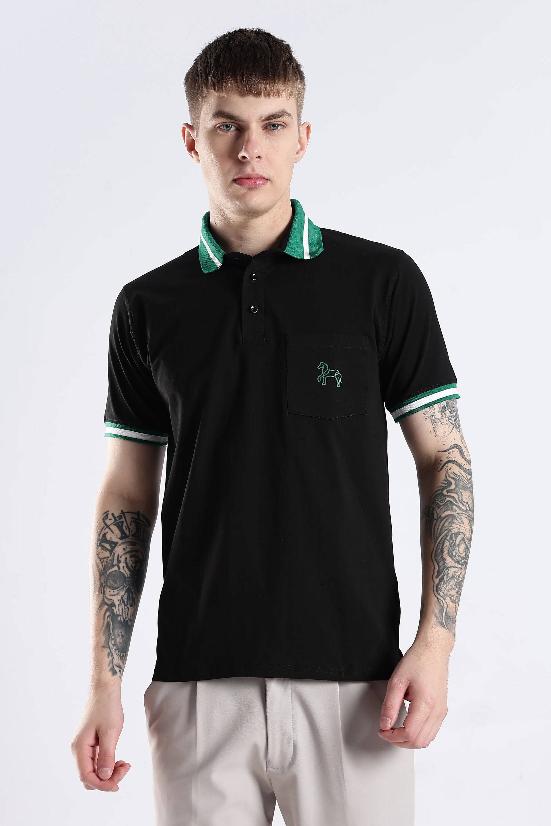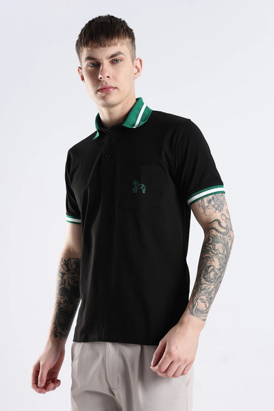 The Emerald Stallion Black Polo blends 96.5% cotton with 3.5% spandex, offering a refined balance of softness and flexibility. Its textured collar and sleeve details add subtle sophistication, while the addition of a practical chest pocket enhances both style and functionality. Designed for breathability and lasting wear, this polo delivers an expert-level finish suited for versatile everyday style.